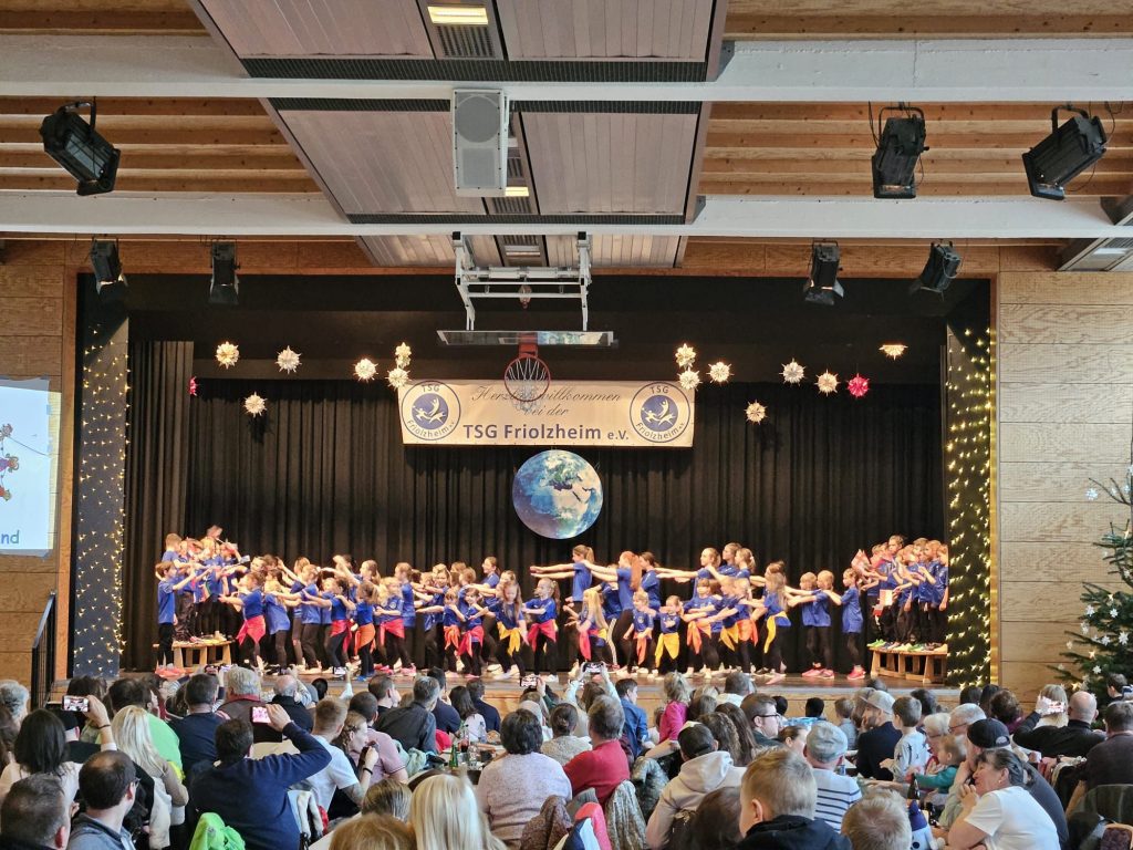 Am Sonntag, den 07.12.2025, fand die diesjährige Nikolausfeier der TSG Friolzheim unter dem Motto „An Weihnachten um die Welt“ statt. Wie jedes Jahr war die Festhalle bis auf den letzten Platz gefüllt – über 350 Besucherinnen und Besucher sorgten für eine großartige Atmosphäre und viel Applaus für die rund 200 mitwirkenden Kinder und Jugendlichen im Alter von 1 bis 16 Jahren.